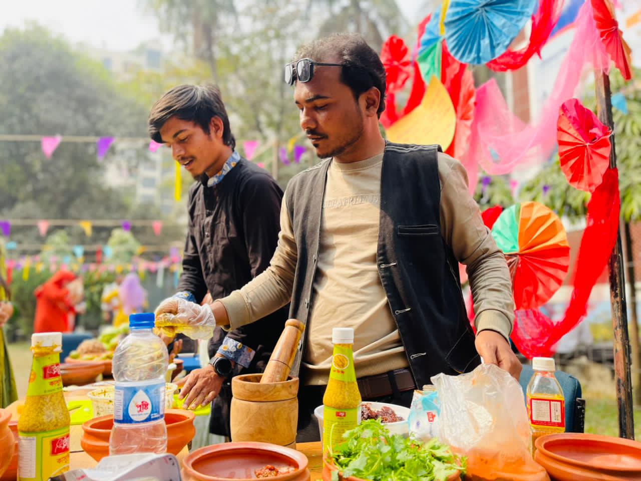 খাবারের জন্য ছিল দুটি ভিন্নধর্মী স্টল। ‘কিচেন কর্নার’ স্টলে ঝালমুড়ি, পুডিং, সিঙারা, রোল, ডিম চপ, সসেজ স্যুপ ও স্যান্ডউইচসহ নানা ফাস্টফুড পরিবেশন করা হয়, যেখানে দিনভর ছিল ক্রেতাদের ভিড়। অন্যদিকে ‘হাটবাজার’ স্টল গ্রামীণ খাদ্য সংস্কৃতির স্বাদ তুলে ধরে ভর্তা স্টাইলে পরিবেশিত পেয়ারা, আনারস ও বড়ই দিয়ে দর্শনার্থীদের মন জয় করে।