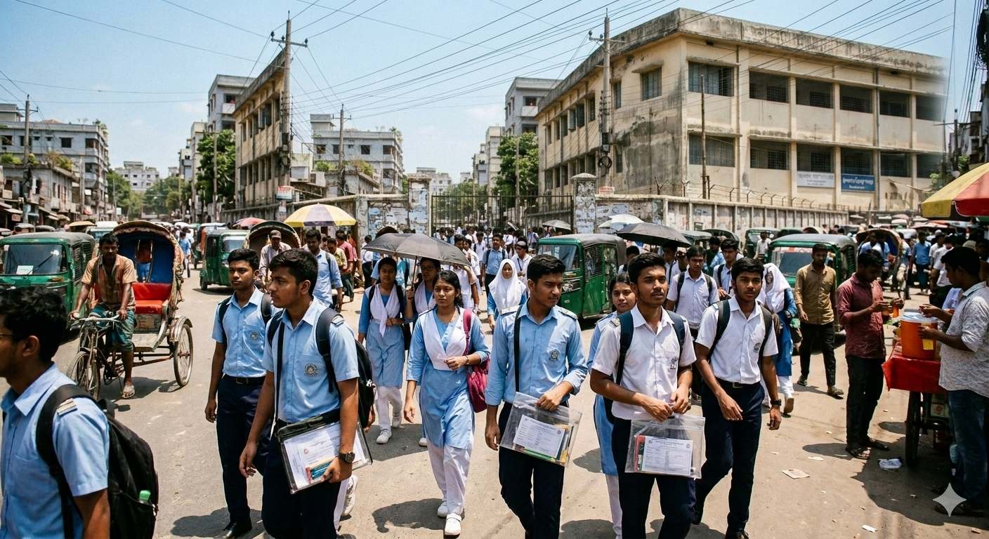 সকালটা তখনও পুরোপুরি জেগে ওঠেনি। তবুও শহরের রাস্তায় শুরু হয়ে গেছে ব্যস্ততা। কাঁধে ব্যাগ, হাতে প্রবেশপত্র আর চোখে অদ্ভুত এক মিশ্র অনুভূতি—উদ্বেগ আর স্বপ্ন। কেউ বাবা-মায়ের সঙ্গে, কেউ বন্ধুদের সঙ্গে, আবার কেউ একাই এগিয়ে যাচ্ছে পরীক্ষাকেন্দ্রের দিকে। মাথার ওপর ঝলসে দেওয়া রোদ, চারপাশে তীব্র গরম—তবুও থেমে নেই তাদের পথচলা। কারণ আজ শুধু একটি পরীক্ষা নয়, এটি তাদের ভবিষ্যতের পথে আরেকটি গুরুত্বপূর্ণ ধাপ।