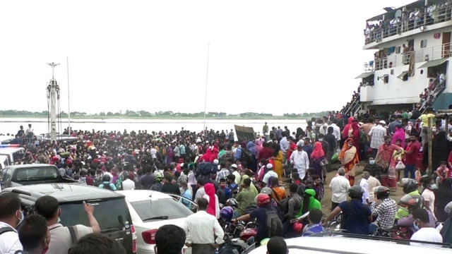 বাংলাবাজার ঘাটে যাত্রী চাপে ফেরিতে জরুরি গাড়ি উঠাতে হিমশিম খাচ্ছে। গার্মেন্টসসহ রপ্তানিমুখী কল-কারখানা খোলার ঘোষণায় এমন পরিস্থিতি সৃষ্টি হয়েছে বলে বিআইডব্লিউটিসি সুত্র দাবি করেছে। পরিস্থিতি সামাল দিতে ফেরির সংখ্যা ছয় থেকে বাড়িয়ে ১০ করা হয়েছে। শিমুলীয়া ঘাট থেকে এ পর্যন্ত ১২টি খালি ফেরি আনা হয়েছে বাংলাবাজার ঘাটে। যাত্রীদের চাপে এদিন অন্তত ১০ ফেরি বাংলাবাজার ঘাট থেকে শুধুমাত্র যাত্রী নিয়ে শিমুলীয়া উদ্দেশে ছেড়ে গেছে।