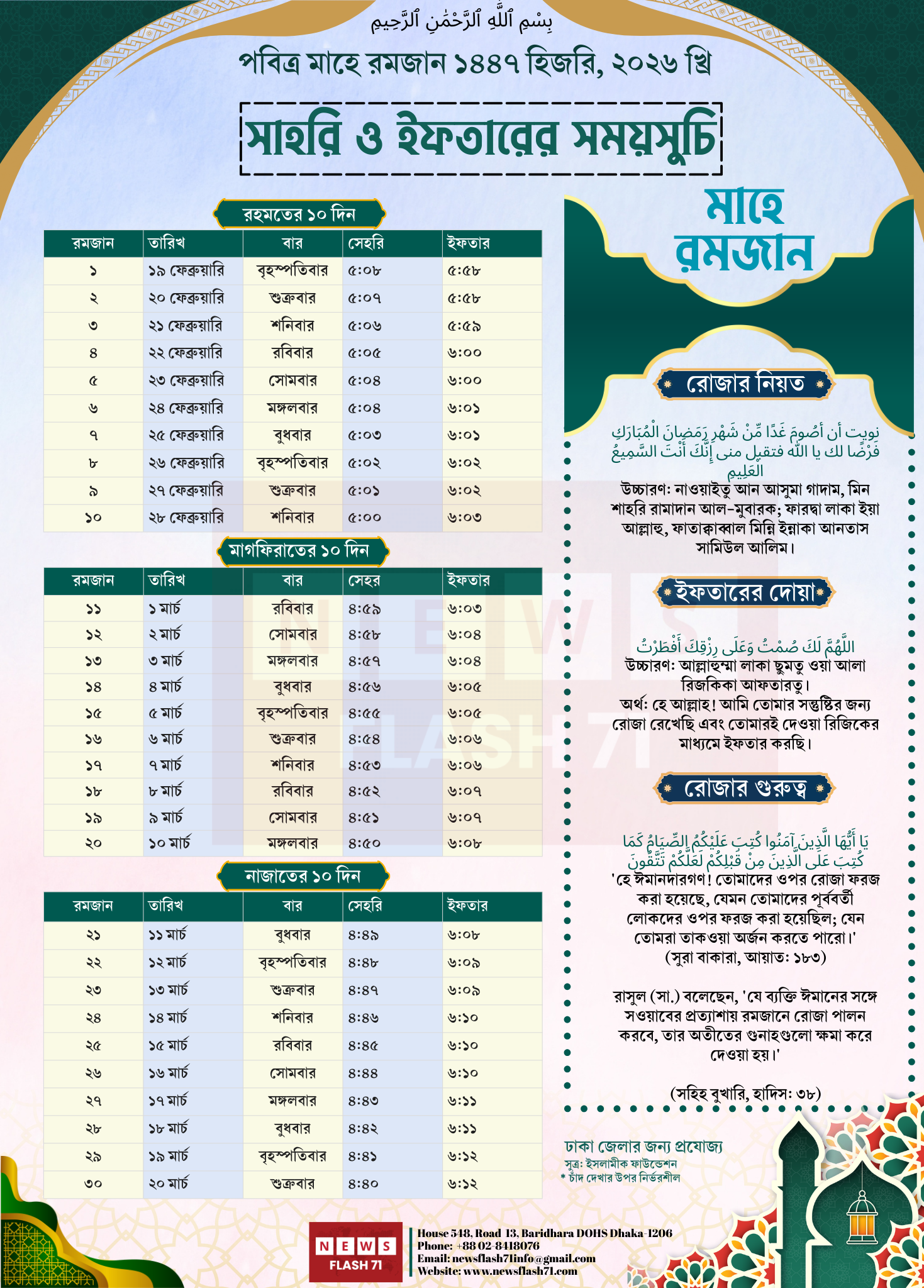 রমজানের ৩০ দিনের সেহরি ও ইফতার সময়সূচি (৩ ভাগে: রহমত, মাগফিরাত, নাজাত) — ডান পাশে নিয়ত ও দোয়া
