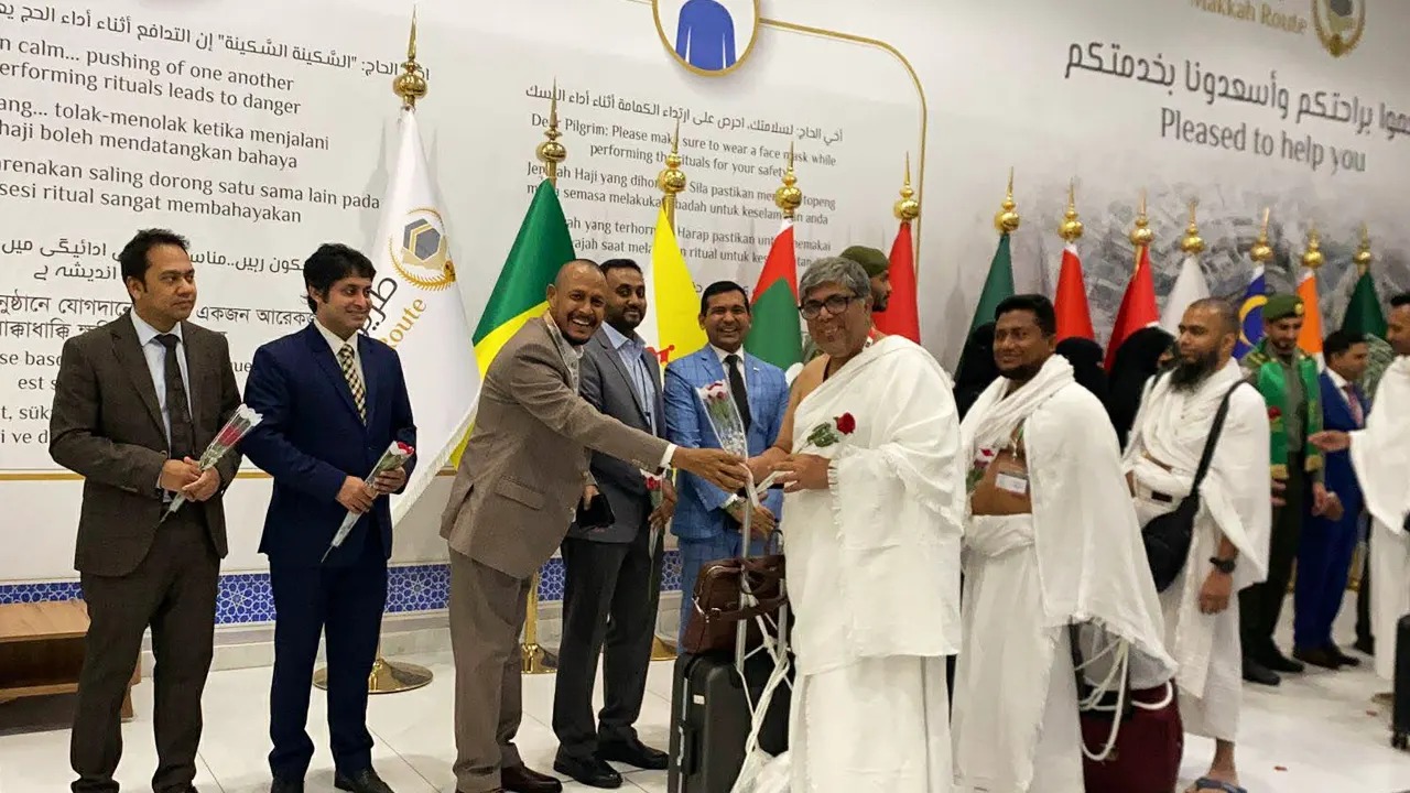 বিমানবন্দরে পৌঁছালে বাংলাদেশি হজযাত্রীদের ফুল দিয়ে স্বাগত জানান সৌদি আরবে নিযুক্ত বাংলাদেশের রাষ্ট্রদূত মো. দেলওয়ার হোসেন এবং কাউন্সিলর (হজ) মো. কামরুল ইসলাম। পরে তাদের হাতে রিফ্রেশমেন্ট কিটও তুলে দেওয়া হয়।