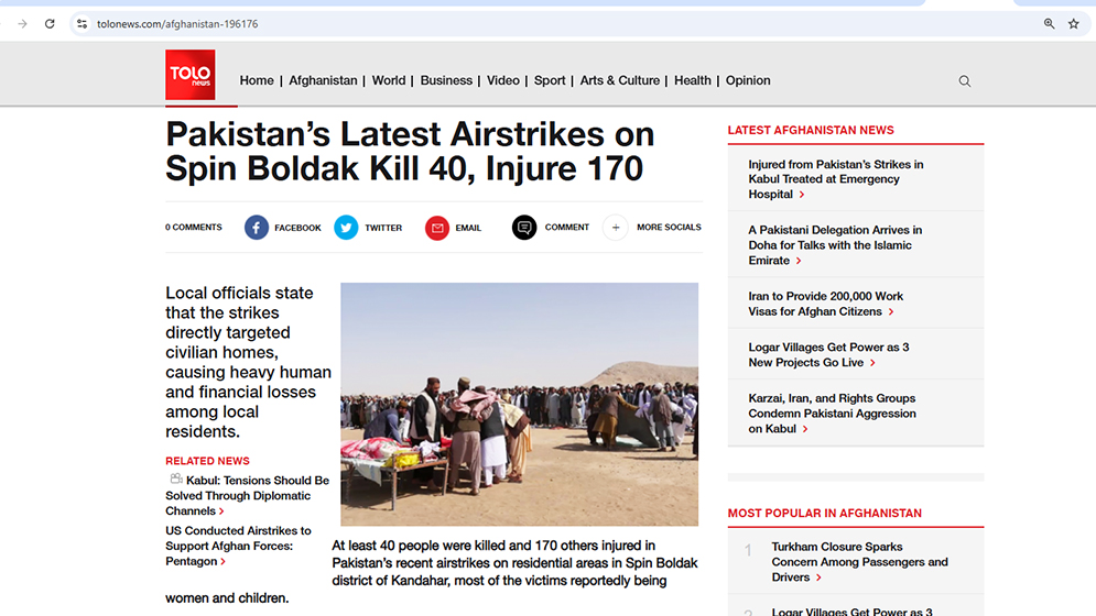 আফগানিস্তানের দক্ষিণাঞ্চলীয় কান্দাহার প্রদেশের স্পিন বোলদাক শহরে ভয়াবহ বিমান হামলা চালিয়েছে পাকিস্তানের বিমান বাহিনী। এ ঘটনায় এখন পর্যন্ত ৪০ জন নিহত এবং অন্তত ১৭০ জন আহত হয়েছেন বলে জানিয়েছে স্থানীয় প্রশাসন।