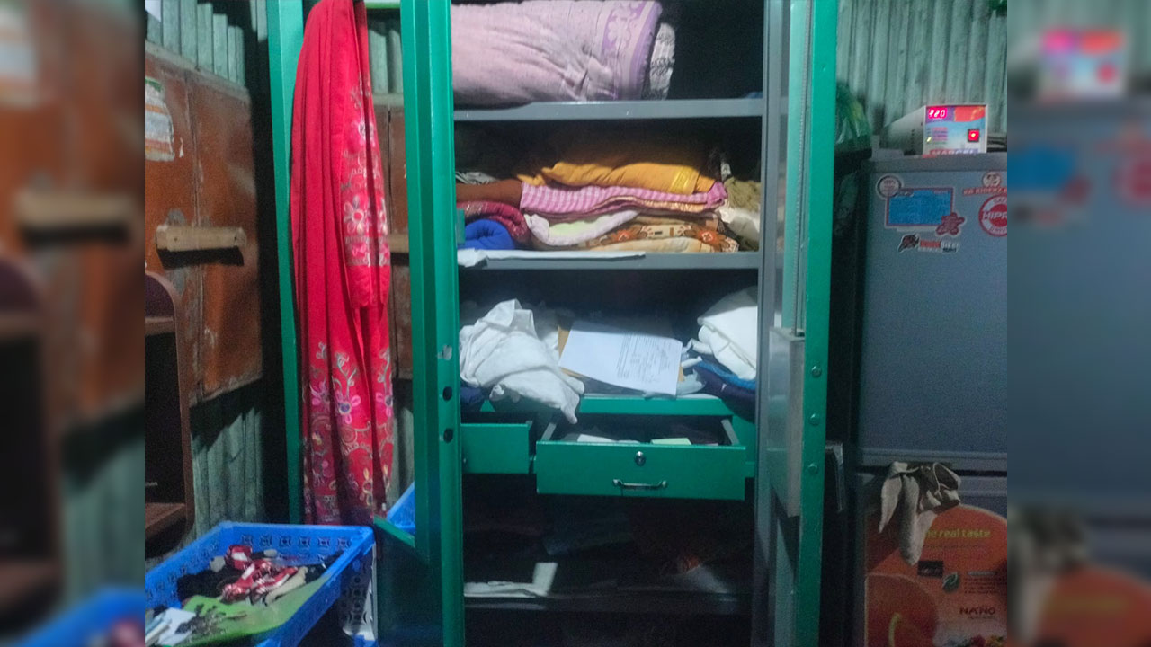 পরে ঘরে ঢুকে দেখা যায়, স্টিলের আলমারি ও একটি ওয়ারড্রোব ভাঙা এবং ঘরের জিনিসপত্র এলোমেলো অবস্থায় পড়ে রয়েছে। আলমারিতে থাকা স্বর্ণের চেইন, আংটি, চুড়িসহ প্রায় ৫ ভরি স্বর্ণালঙ্কার এবং ব্যবসার নগদ ৬ লাখ টাকা চুরি হয়ে যায়।