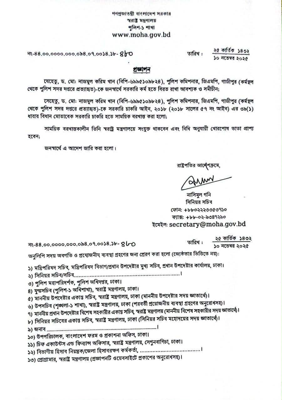 “গাজীপুর মহানগর পুলিশের কমিশনার (কর্মস্থল থেকে পুলিশ সদর দপ্তরে প্রত্যাহৃত) মো. নাজমুল করিম খানকে জনস্বার্থে সরকারি কর্ম থেকে বিরত রাখা আবশ্যক ও সমীচীন বিবেচিত হওয়ায় সরকারি চাকরি আইন অনুযায়ী তাকে সাময়িক বরখাস্ত করা হলো।”