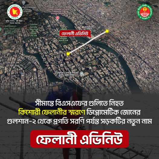 গতকাল মঙ্গলবার (৯ ডিসেম্বর) এক ফেসবুক বার্তায় বিষয়টি নিশ্চিত করেন অন্তর্বর্তী সরকারের উপদেষ্টা আসিফ মাহমুদ সজীব ভূঁইয়া। তিনি জানান, ডিপ্লোমেটিক জোনের এই সড়কটি এখন থেকে ‘ফেলানী এভিনিউ’ নামে পরিচিত হবে, যা সীমান্তে বিএসএফের গুলিতে নিহত হতভাগ্য কিশোরী ফেলানীর প্রতি একটি প্রতীকী শ্রদ্ধা।