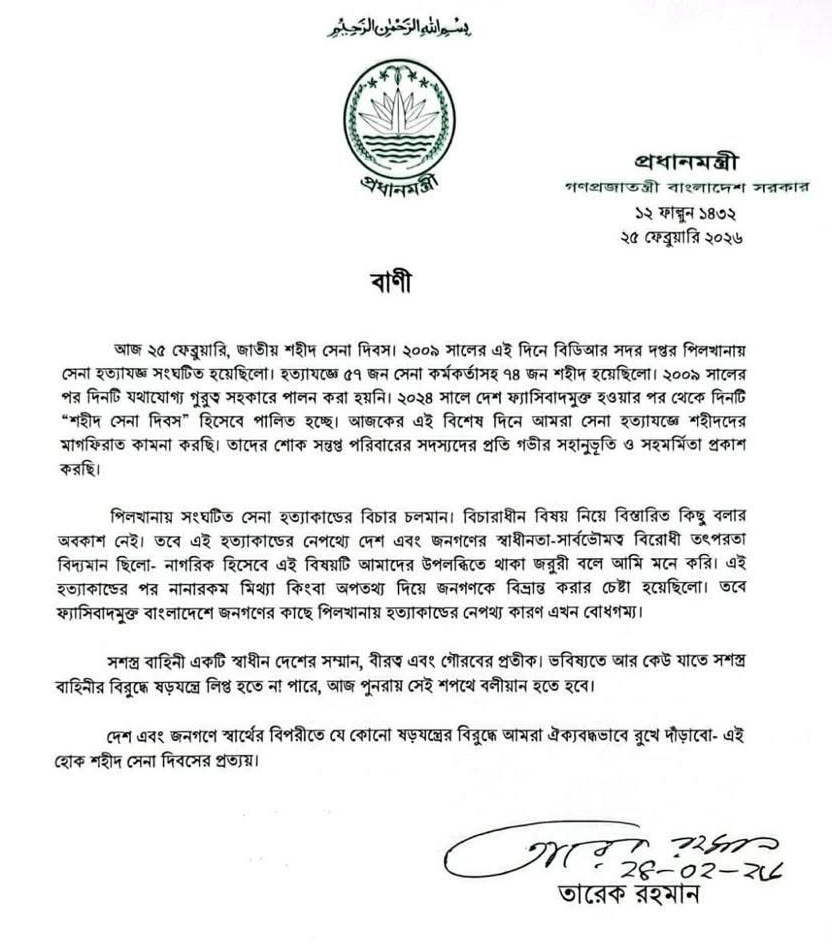 ফ্যাসিবাদমুক্ত বাংলাদেশে পিলখানার হত্যাকাণ্ডের নেপথ্যের কারণ এখন জনগণের কাছে স্পষ্ট- এমন মন্তব্য করেছেন প্রধানমন্ত্রী তারেক রহমান। মঙ্গলবার (২৪ ফেব্রুয়ারি) জাতীয় শহীদ সেনা দিবস (২৫ ফেব্রুয়ারি) উপলক্ষে দেওয়া এক বাণীতে এ মন্তব্য করেন প্রধানমন্ত্রী।