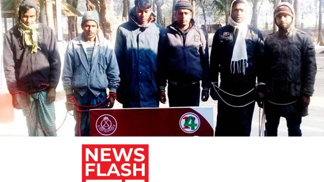 পত্নীতলা ১৪ বিজিবি ব্যাটালিয়নের অধিনায়ক লেফটেন্যান্ট কর্নেল এসএম নাদিম আরেফিন সুমন শুক্রবার (৫ ফেব্রুয়ারি) বিকেলে এক প্রেস বিজ্ঞপ্তিতে এ তথ্য নিশ্চিত করে জানান, গোপন সংবাদের ভিত্তিতে বৃহস্পতিবার ভোরে অভিযান চালিয়ে উপজেলার চকিলাম বিওপির অন্তর্গত দূর্গাপুর সীমান্তে ২৫৬/৩-আর এর পাঁচশত গজ অভ্যন্তরে মাঠের মধ্য থেকে ছয়জনকে আটক করা হয়।