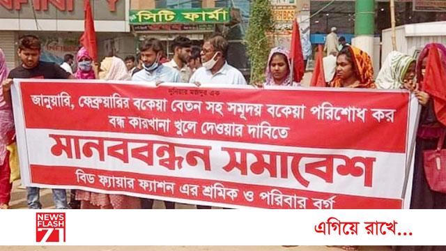 সাভারে বকেয়া বেতনের পরিশোধের দাবিতে মানববন্ধন