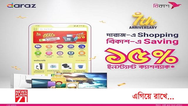 দারাজ থেকে পণ্য কিনে বিকাশে পেমেন্ট করলে ১৫% পর্যন্ত সর্বোচ্চ ২০০ টাকা ক্যাশব্যাক পাচ্ছেন গ্রাহক। অনলাইন কেনাকাটার প্ল্যাটফর্ম দারাজ এর ৭ম বর্ষপূর্তি উপলক্ষে ৮ সেপ্টেম্বর পর্যন্ত অফারটি নিতে পারবেন সকল বিকাশ গ্রাহক।