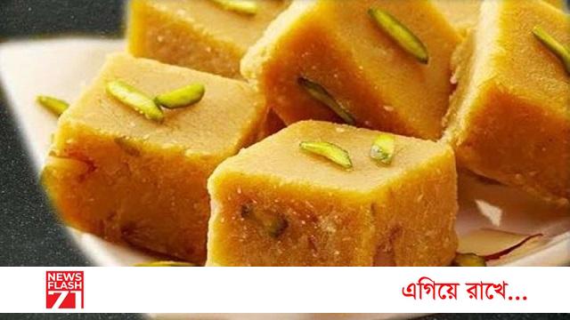 হালুয়া যে ট্রে বা থালায় রাখবেন সেটিতে ঘি মাখিয়ে এক পাশে রেখে দিন। এবার সব উপকরণ ভালোভাবে ব্লেন্ড করে নিন। চুলায় প্যান বসিয়ে তাতে মিশ্রণটি ঢেলে মাঝারি আঁচে অনবরত নাড়তে থাকুন। ছয়-সাত মিনিট পর এটি ঘন হতে শুরু করবে। এভাবে পনেরো মিনিটের মতো নাড়তে থাকুন। এই পর্যায়ে হালুয়া তৈরি হয়ে আর ঘি ছাড়তে শুরু করবে। এবার নামিয়ে নিন। হালকা গরম অবস্থায় ট্রেতে ঢেলে পছন্দে শেপে কেটে নিন। পরিবেশনের আগে ঘণ্টা দুয়েক ফ্রিজে রেখে ঠান্ডা করে খাবেন।