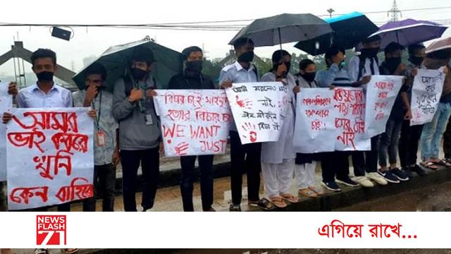বৃষ্টি উপেক্ষা করে মুখে কালো কাপড় বেঁধে অবস্থান কর্মসূচি পালন করেছে শিক্ষার্থীরা