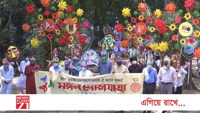 বুধবার (১৪ এপ্রিল) সকালে চারুকলা অনুষদের শিল্পীদের তৈরি বিভিন্ন মুখোশ নিয়ে অনুষদ প্রাঙ্গণে স্বাস্থ্যবিধি অনুসরণ করে ও শারীরিক দূরত্ব বজায় রেখে সংক্ষিপ্তভাবে প্রতীকী মঙ্গল শোভাযাত্রা আয়োজন করা হয়।