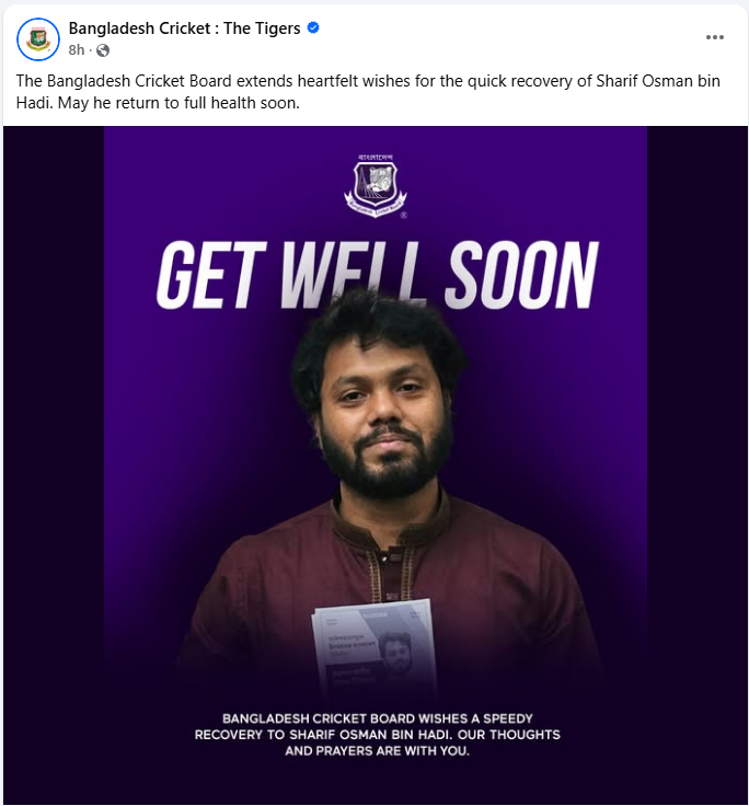 ‘বাংলাদেশ ক্রিকেট বোর্ড শরিফ ওসমান বিন হাদির দ্রুত আরোগ্য কামনা করছে। তিনি যেন শিগগিরই পূর্ণ সুস্থ হয়ে ফিরে আসেন—এই কামনা করছে বোর্ড। আমাদের ভাবনা ও প্রার্থনা আপনার সঙ্গে আছে।’